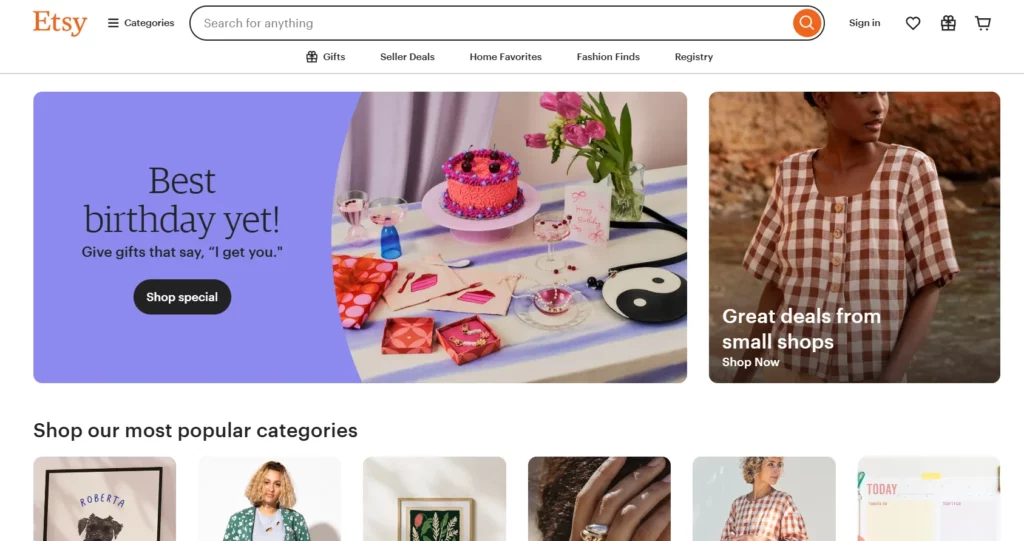 Etsy is the go-to platform for artisans, crafters, and vintage sellers looking for a niche audience that values handmade and one-of-a-kind items. Unlike all-purpose ecommerce platforms, Etsy is designed specifically for creative entrepreneurs who want to reach customers who appreciate craftsmanship and uniqueness.