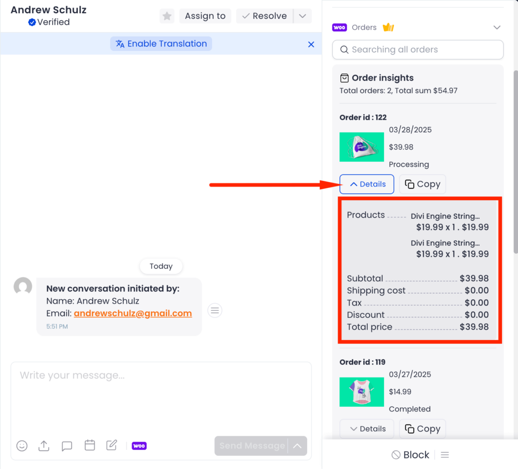 But that’s not it, once you click the Details dropdown, you will see more information about the order like tracking, purchased product’s name, amount, quantity, subtotal, shipping cost, tax, total price, and the billing address.