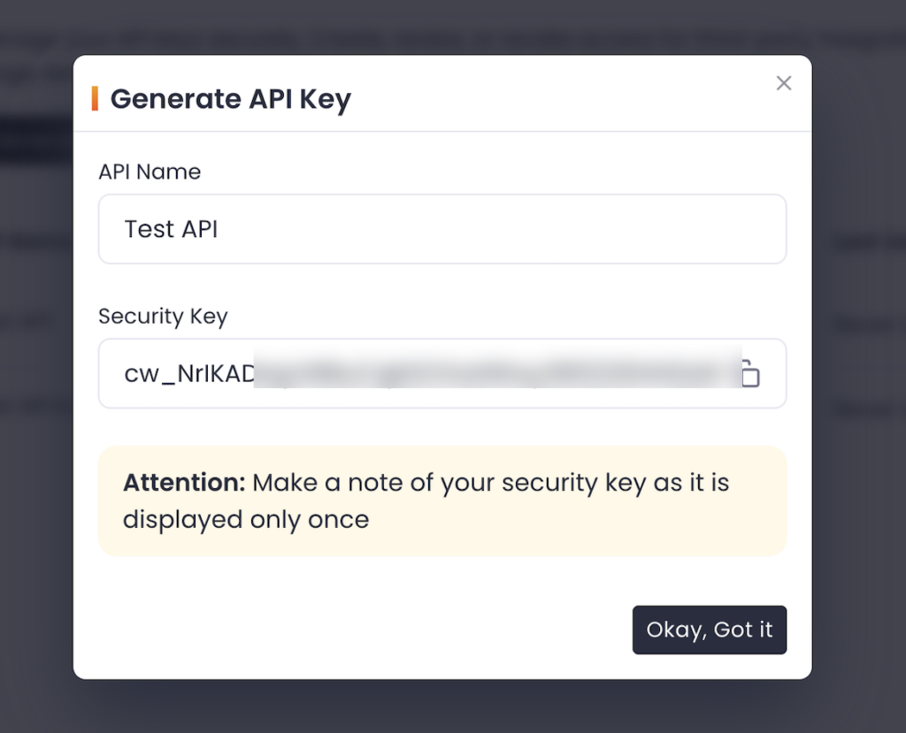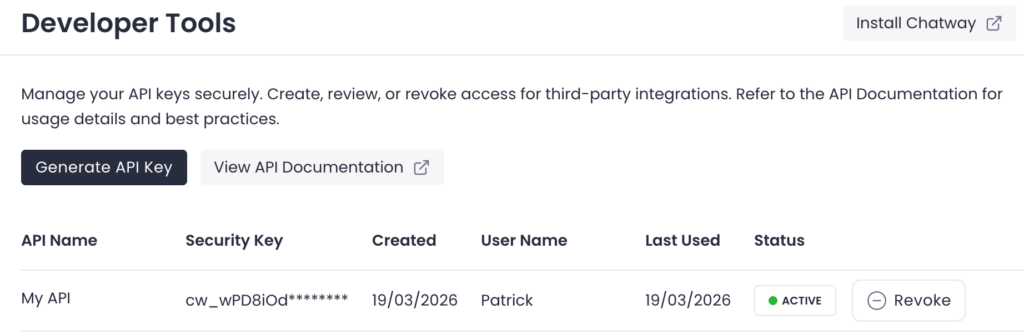 Chatway will display the full API key only once when it is created. Once it’s created, you’ll only see a partial view in your dashboard. For example: